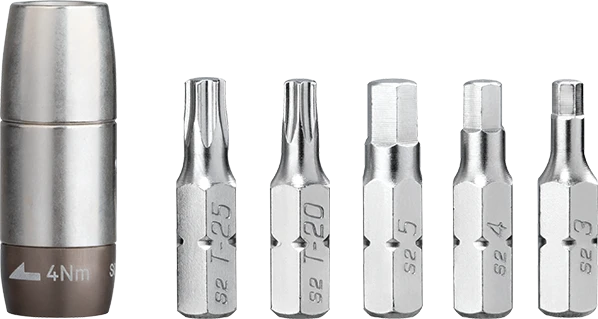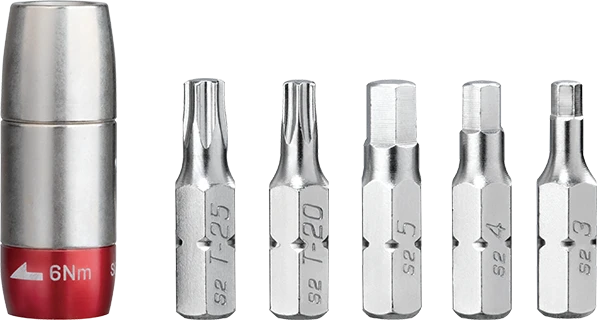Deze vast ingestelde momentbithouder werkt met elke 5 mm inbussleutel (ook van een multitool). Het gebruik van een momentsleutel is aan te raden bij het monteren van onderdelen om zo schade aan het onderdeel of het frame te voorkomen. In de bewaarcase zitten de volgende onderdelen: